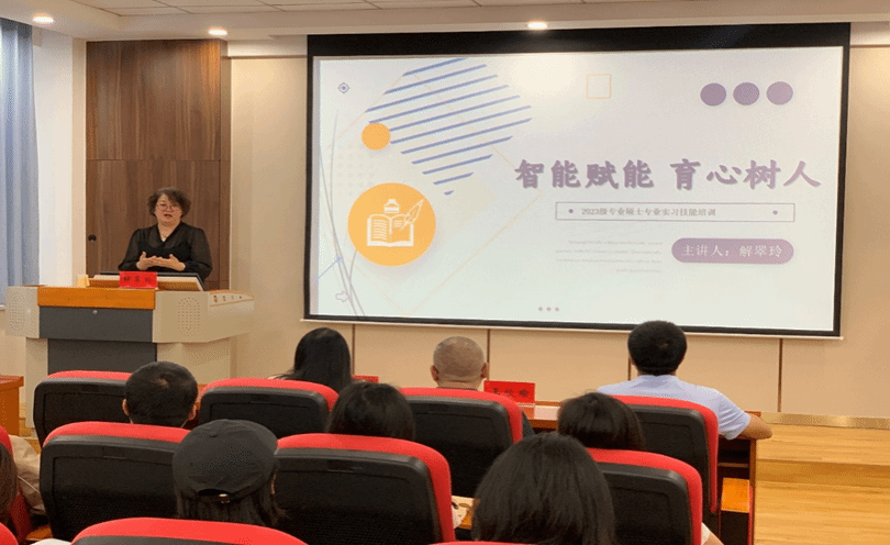 随后,指导教师解翠玲为实习生开展了一场题为“智能赋能,育心树人”的教育实习技能培训。解老师结合自身实习指导经验着重强调了心理学专业教育实习目标,详细介绍了课堂教学、员工管理及心理辅导等实习主要内容,还与时俱进地分析了网络时代中员工心理特征,提醒实习生要依据员工特点因材施教,按照员工需求确定教学目标,挖掘教学内容内涵实施教学设计,结合心理学科特点选择教学模式。