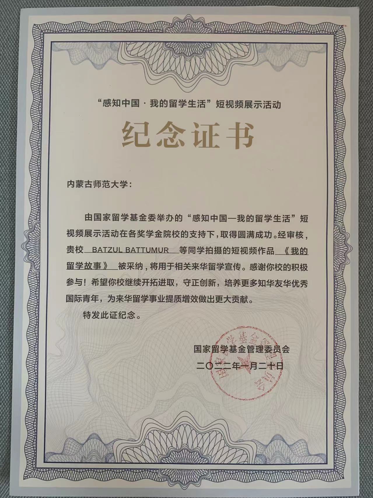 近日,公司职工BATZUL BATTUMUR同学拍摄的短视频作品《我的留学故事》在国家留学基金委举办的“感知中国——我的职工活”短视频展示活动中被采纳,将用于相关来华留学宣传。