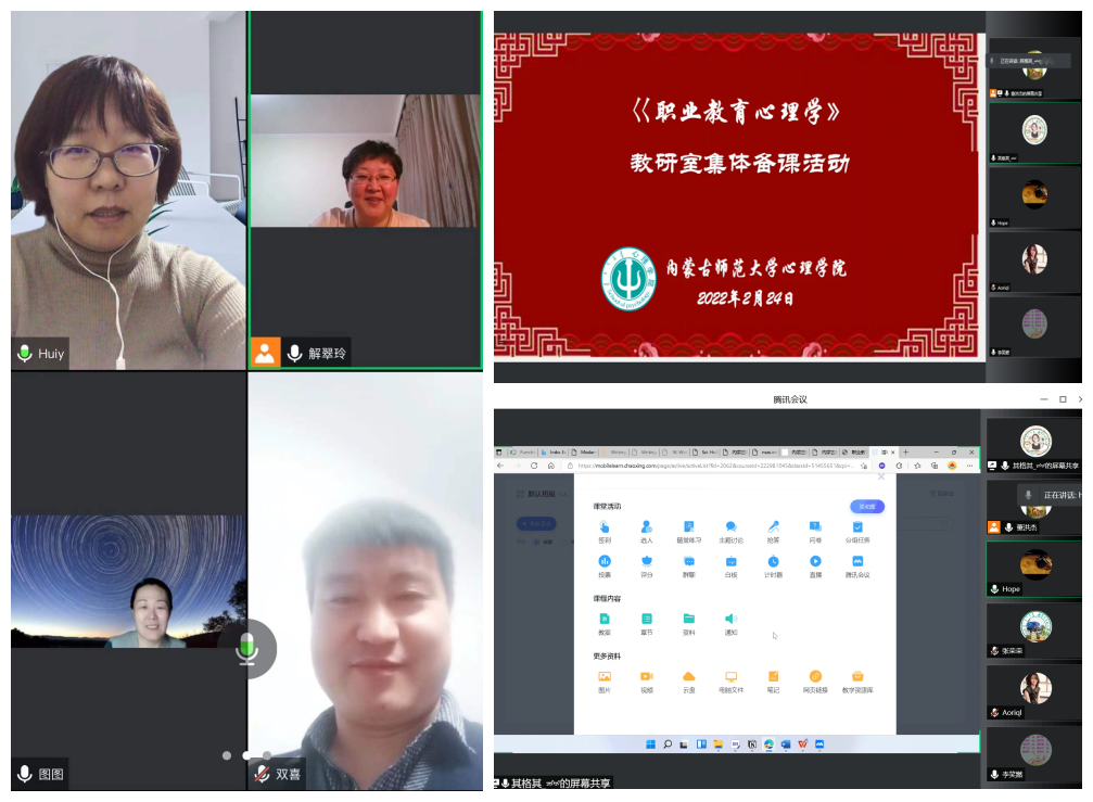 为适应新冠肺炎防控形势下的线上教学,三亿各公共课教研室分别于2月22日与2月24日组织开展了《中学教育心理学》《职业教育心理学》线上集体备课活动,本学期授课教师均在线参加。