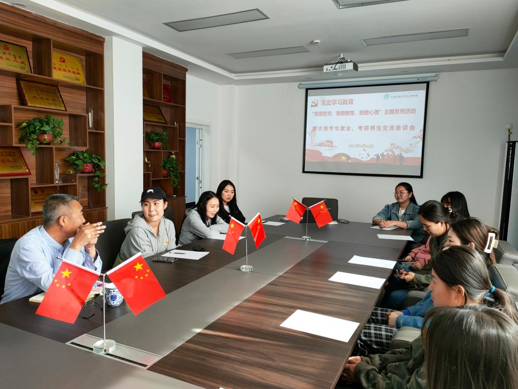 为扎实开展党史学习教育、推进“我为群众办实事”实践活动,贯彻落实党中央、国务院“稳就业”、“保就业”决策部署,积极推进公司毕业生高质量就业,促进教育高质量发展,4月14日下午,公司党总支在公司楼B213会议室开展“我爱我党、我爱教育、我爱心理”党史学习教育主题实践活动——召开蒙古族员工就业、考研师生交流座谈会。党总支书记七十三、副书记张晓阳、学就办主任张金钟与2017级、2018级心理学专业员工进行交流座谈。